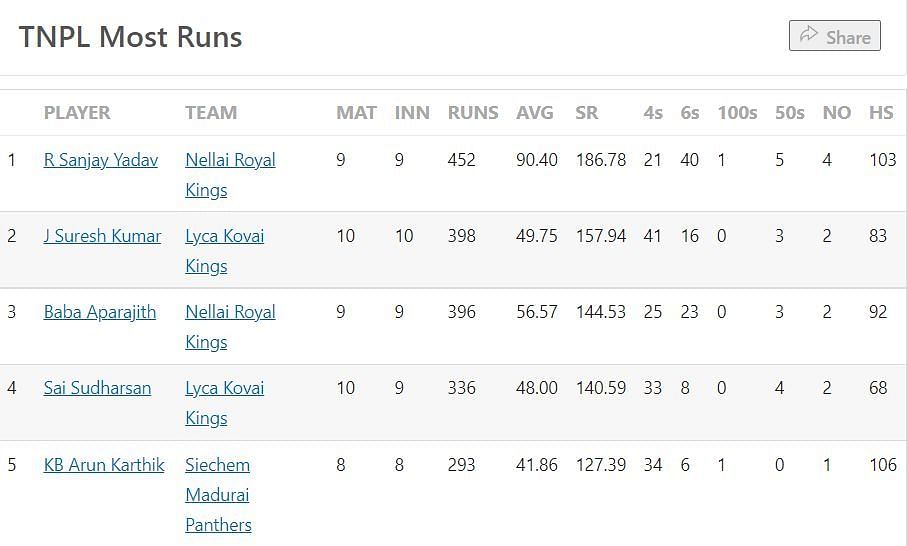 R Sanjay Yadav had a memorable season, finishing as the highest run-scorer with 452 runs in nine games at an average of 90.40. He played a key role for Nellai Royal Kings, helping them reach the playoffs, smashing five fifties and a century.