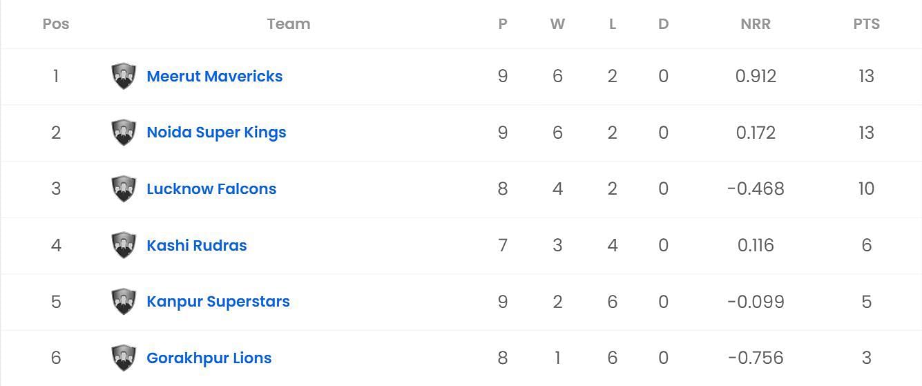 Lucknow Falcons find themselves in third position followed by Kashi Rudras in fourth. Kanpur Superstars take the fifth spot while Gorakhpur Lions are rock bottom.
