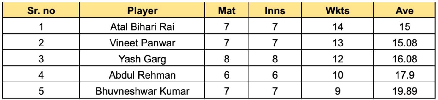 Kashi pacer Atal Bihari Rai is the leading wicket-taker with 14 wickets from seven innings. Kanpur's Vineet Panwar finds himself in second spot with 13 wickets.