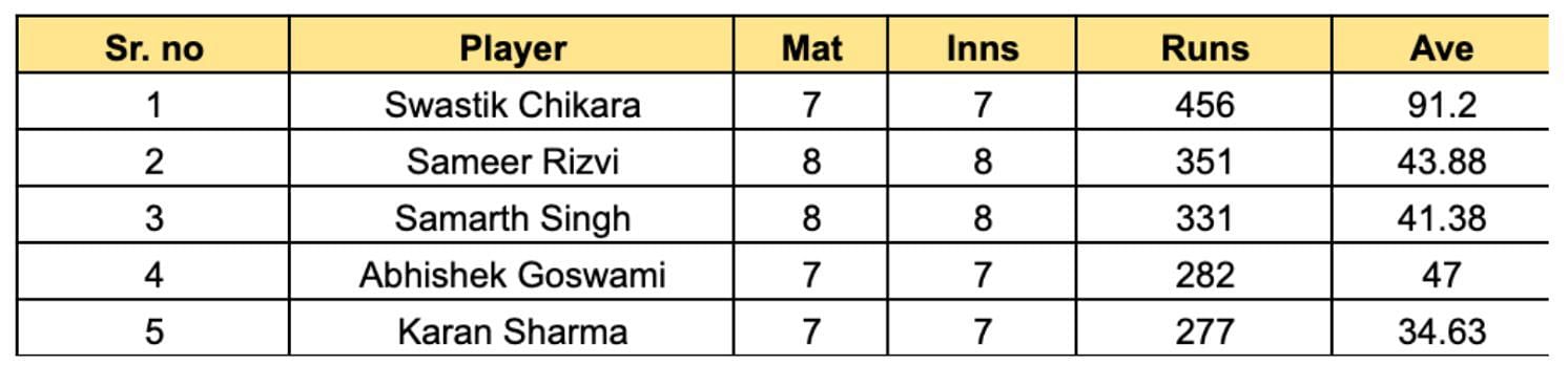 Noida captain Samarth Singh's 45-run knock against Meerut propelled him to the third slot with 331 runs while Lions batter Abhishek Goswami sits in fourth with 282 runs from seven innings. Kashi skipper Karan Sharma rounds out the top five with 277 runs.