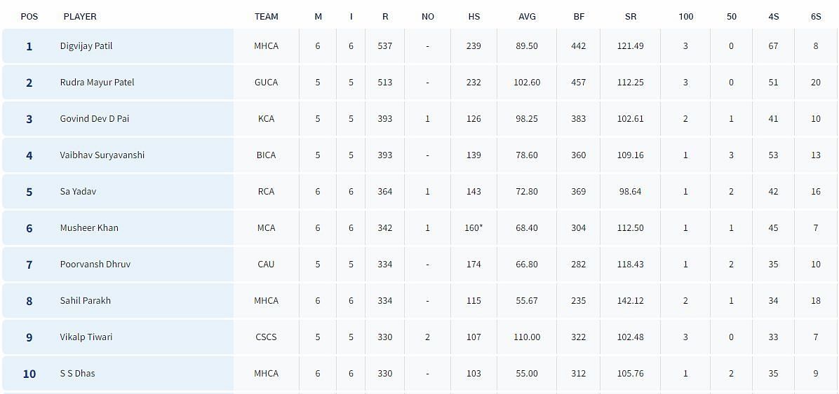 The third place has been taken by Govind Dev D Pai who has 393 runs at a strike rate of 102.61. Meanwhile, Vaibhav Suryavanshi and Sa Yadav are placed at fourth and fifth respectively with 393 and 364 runs.
