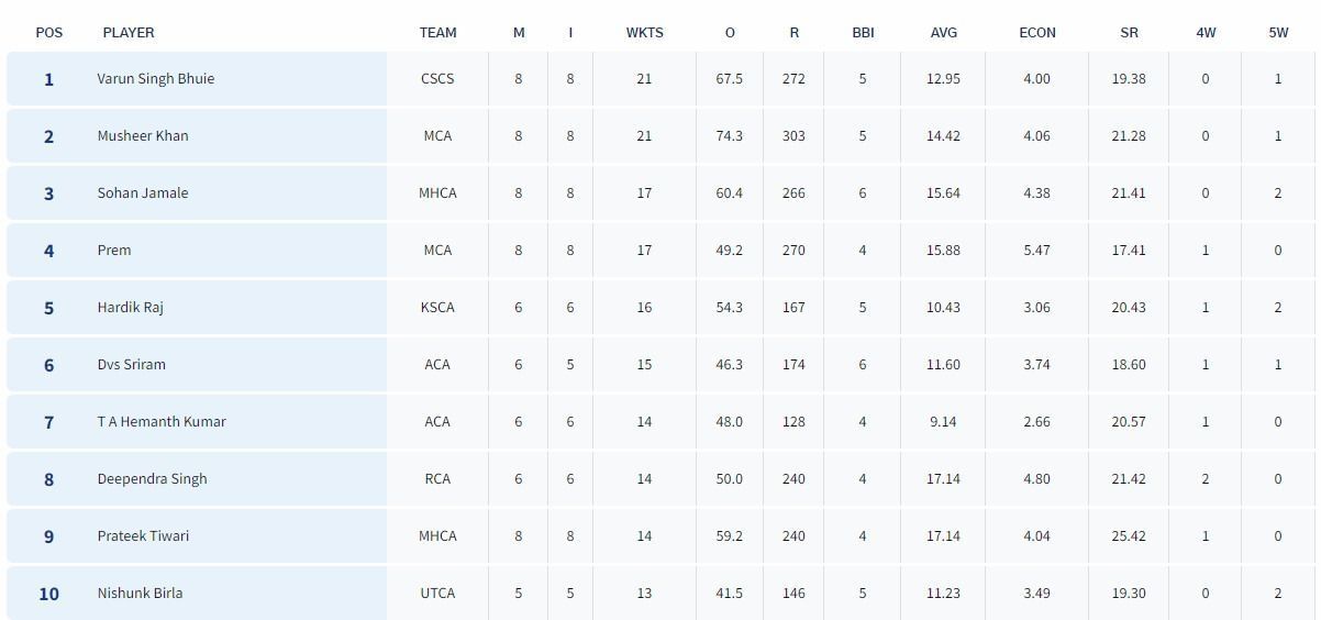 Chhattisgarh captain Varun Singh Bhuie surpassed Mumbai captain Musheer Khan in the top place after claiming 3 for 47 in the semi-final, taking the tally to 21.