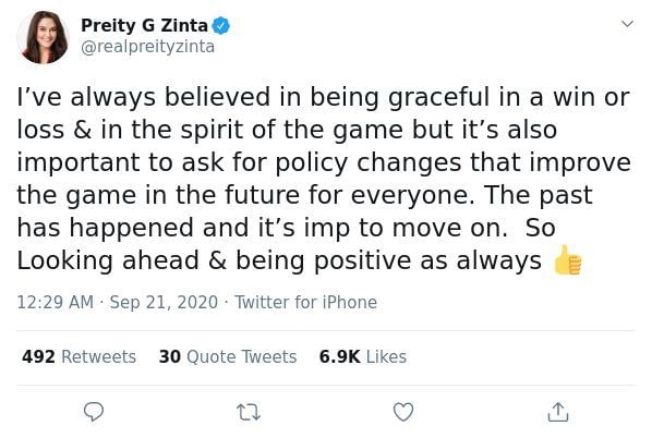 "I’ve always believed in being graceful in a win or loss & in the spirit of the game but it’s also important to ask for policy changes that improve the game in the future for everyone. The past has happened and it’s imp to move on. So Looking ahead & being positive as always," urged Preity Zinta.