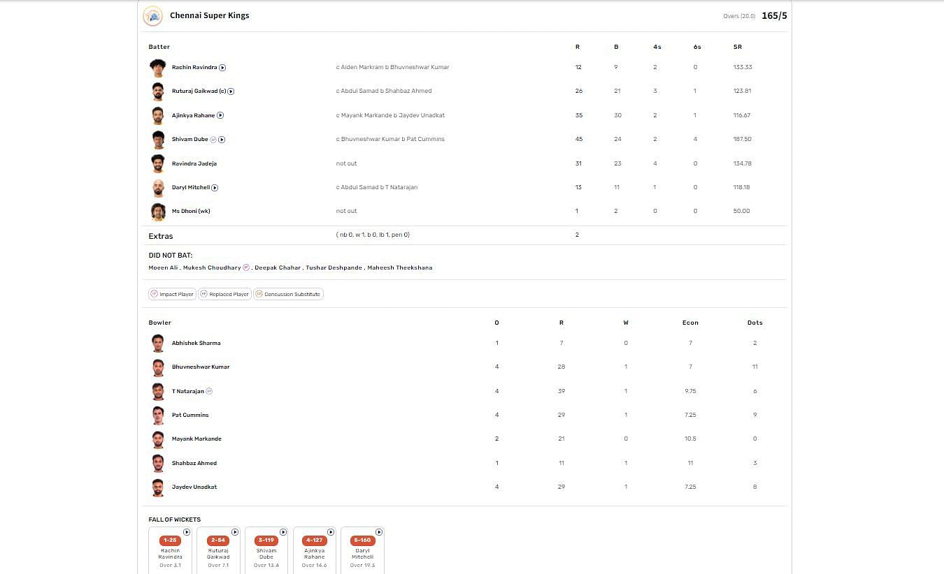 Asked to bat first, CSK posted 165/5 in 20 overs. Shivam Dube top scored with 45 off 24 balls in an innings featuring four sixes and two boundaries. Ajinkya Rahane, Ravindra Jadeja and Ruturaj Gaikwad also chipped in with 35 (30), 31*(23) and 26 (21), respectively.
