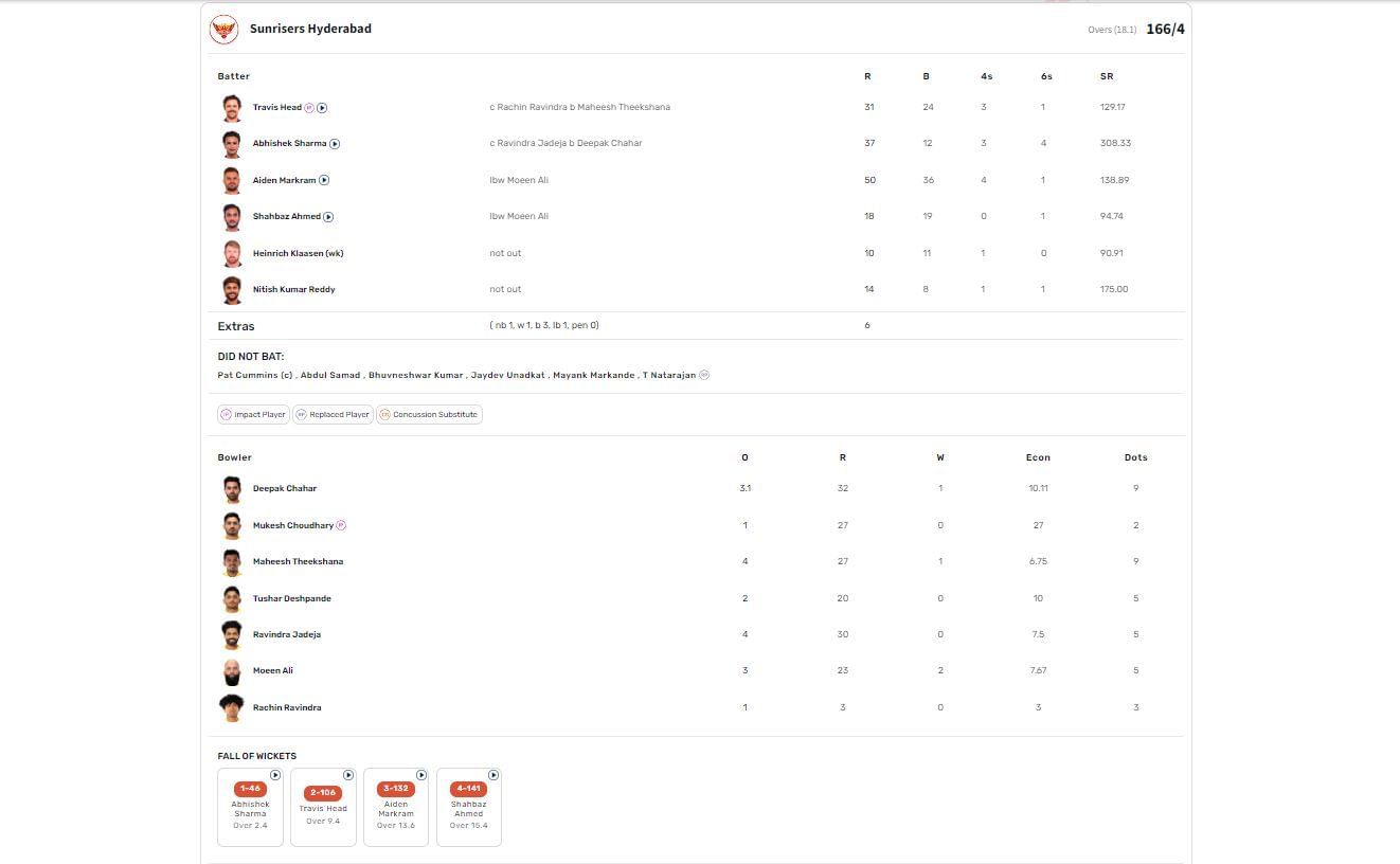 In response, SRH achieved the target with 11 balls to spare. Aiden Markram starred with the bat, scoring 50 off 36 with the help of one six and four boundaries. Abhishek Sharma and Travis Head also chipped in with 37 (12) and 31 (24), respectively.