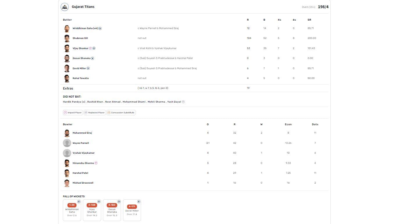 In response, GT achieved the target with five balls to spare. Captain Shubman Gill led from the front, scoring an unbeaten 104 off 52 deliveries with the help of eight sixes and five boundaries. Vijay Shankar also smashed 53 off 35, comprising two sixes and seven fours. The duo shared a 123-run partnership for the second wicket.