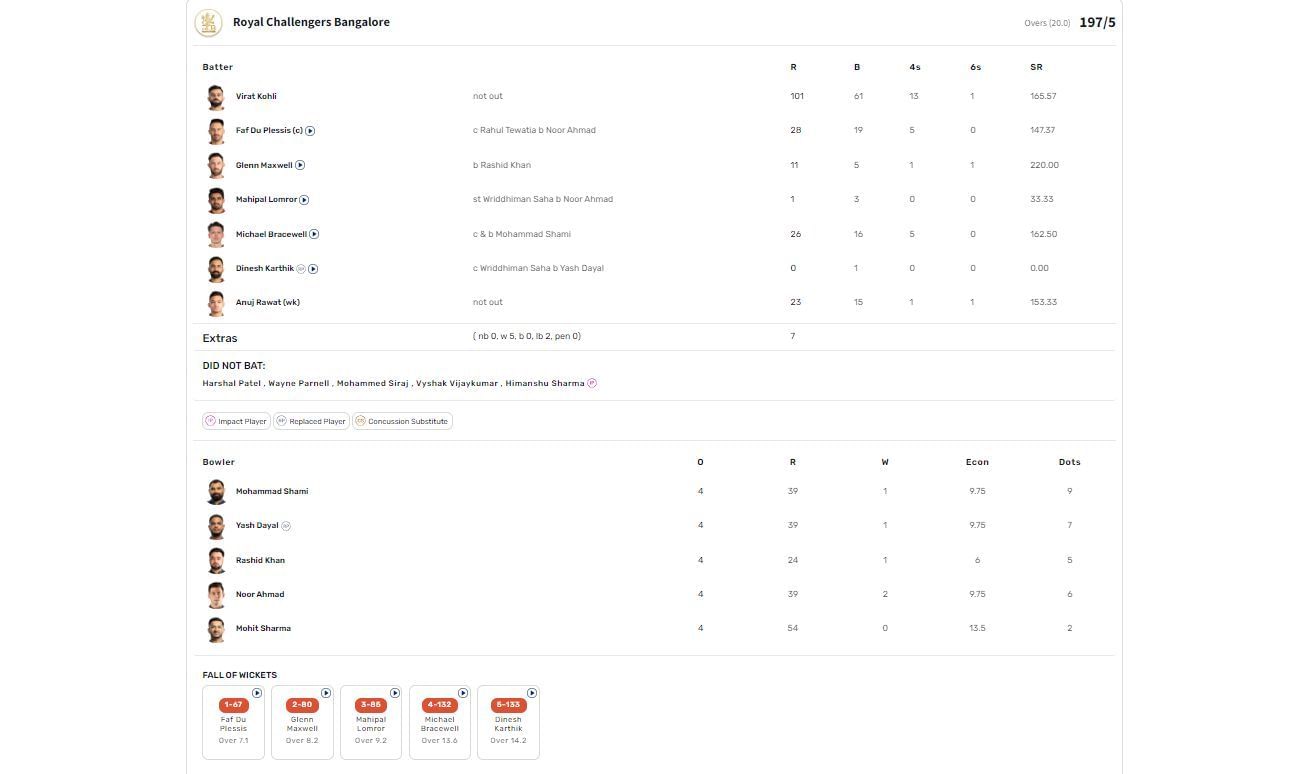 Virat Kohli starred with the bat, scoring an unbeaten 101 runs off 61 balls in an innings laced with one six and 13 boundaries. Captain Faf du Plessis, Michael Bracewell and Anuj Rawat also chipped in with 28 (19), 26 (16), and 23*(15), respectively.
