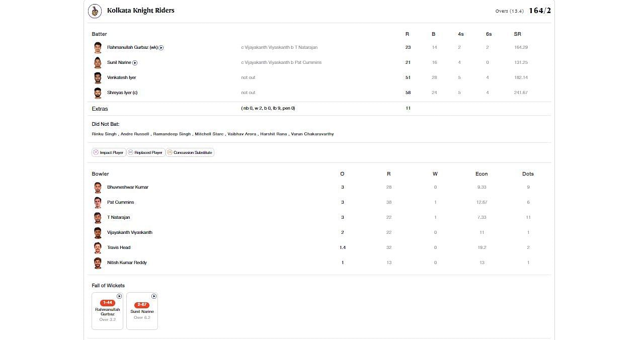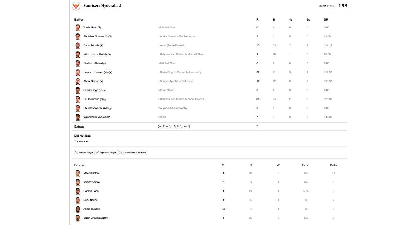 Heinrich Klaasen, Pat Cummins and Abdul Samad chipped in with 32 (21), 30 (24), and 16 (12), respectively, to help the team go past 150. Mitchell Starc picked up three wickets for KKR, while Varun Chakaravarthy bagged two.
