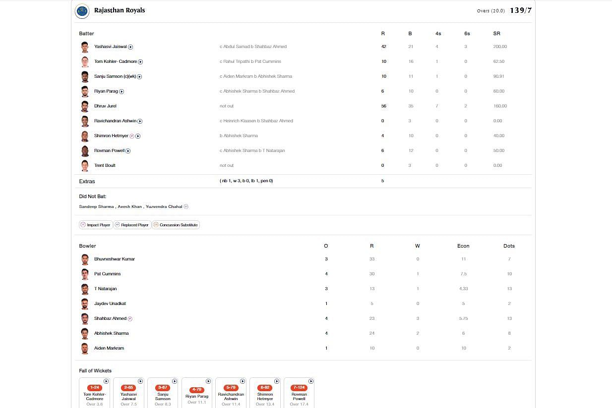Asked to bat first, SunRisers put up 175/9 in 20 overs. They suffered a poor start as Trent Boult dismissed Abhishek Sharma, Aiden Markram and Rahul Tripathi inside powerplay overs. Avesh Khan then dominated the powerplay overs by dismissing Nitish Reddy, Abdul Samad and Shahbaz Ahmed cheaply. Sandeep Sharma took the prized wickets of Travis Head and Heinrich Klaasen.