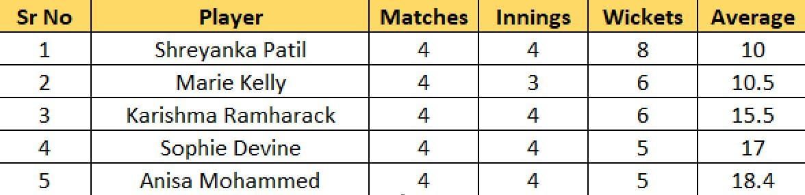Shreyanka Patil of Guyana Amazon Warriors has jumped to the top spot in the most wickets charts after the conclusion of the league stage. The off-spinner from India registered figures of 2/10 in her four overs against the Knight Riders and has taken her tally to eight in the competition.