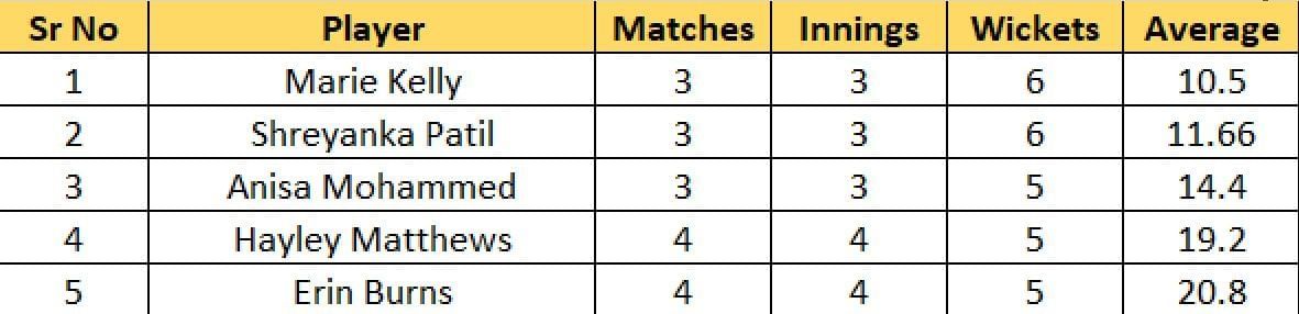 Marie Kelly of Trinbago Knight Riders has jumped to the top position in the most wickets list after the conclusion of match five. Kelly bowled well against the Barbados Royals Women and picked the prized wicket of Erin Burns in her four-over spell. She now has six wickets to her name in three games and sits at the top of the most wickets charts.