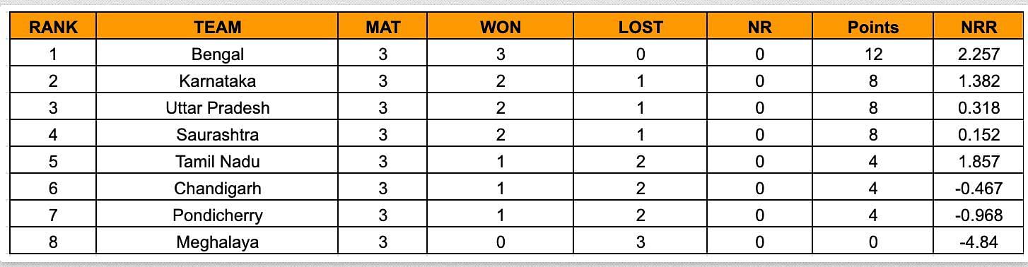 In Group B, Bengal are the table toppers with 12 points from three matches. They are yet to lose to a team after playing three games. Uttar Pradesh, Karnataka and Saurashtra and the next-ranked sides in this group with two wins each.