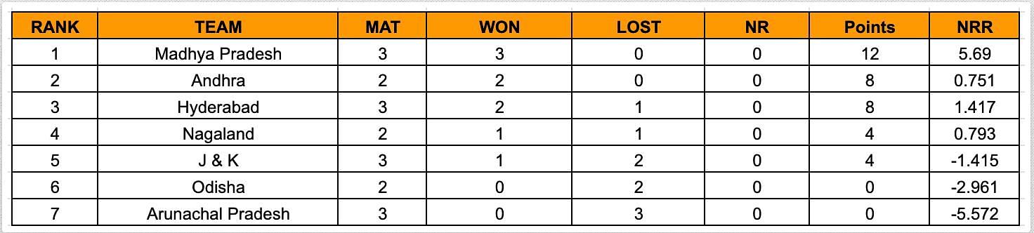 In Group E, MP is holding the pole position with a hat-trick of victories. Andhra registered their second consecutive win to hold on to the second position.
