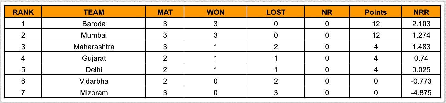 Shifting our attention to Group C, Baroda and Mumbai registered three consecutive wins apiece to bag the top two spots in the standings. Both sides have secured 12 points each with a net run rate of 2.103 and 1.274 respectively.