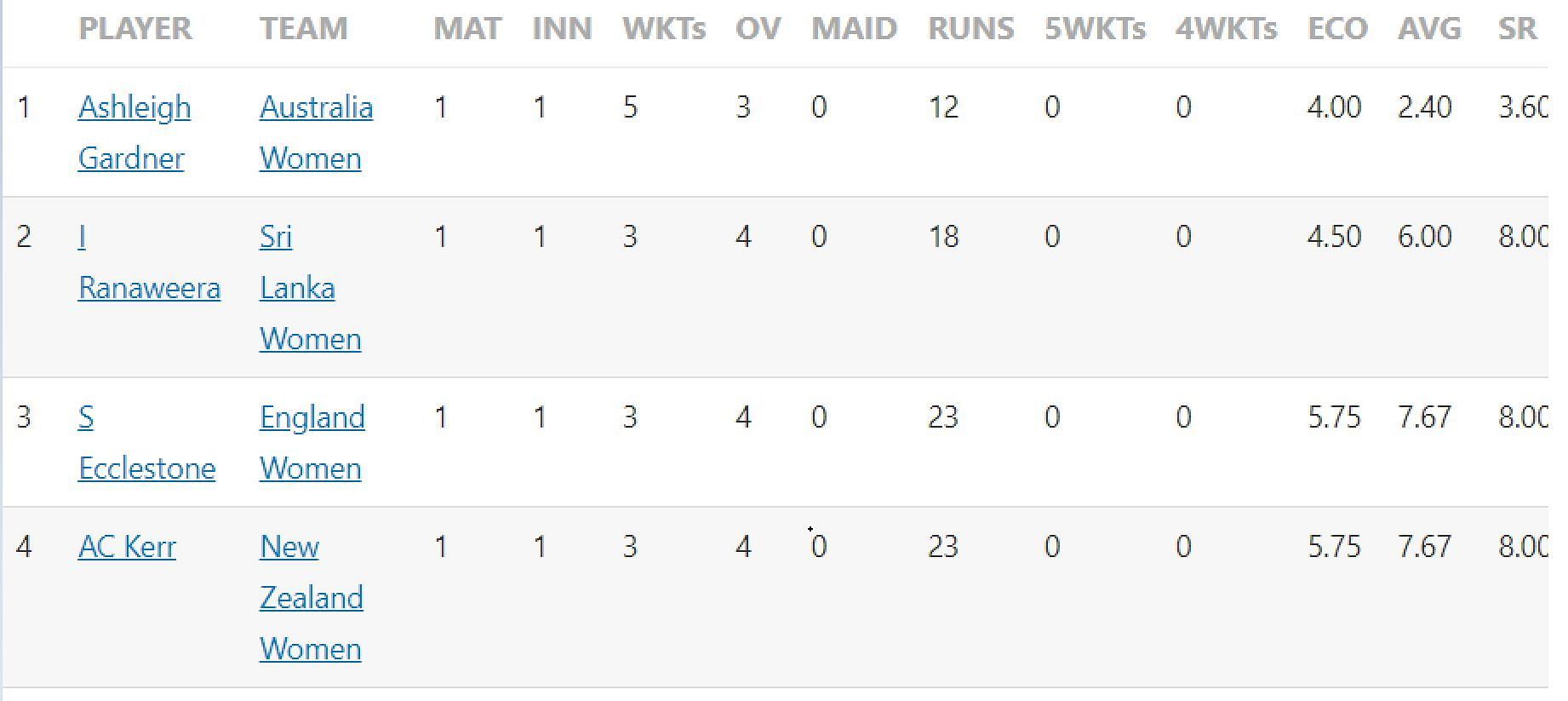 Sri Lanka’s Inoka Ranaweera is second on the list with three wickets. Sophie Ecclestone, Amelia Kerr and Lea Tahuhu also have three wickets apiece so far. Megan Schutt got two important wickets of Sophie Devine and Suzie Bates in the game against New Zealand.