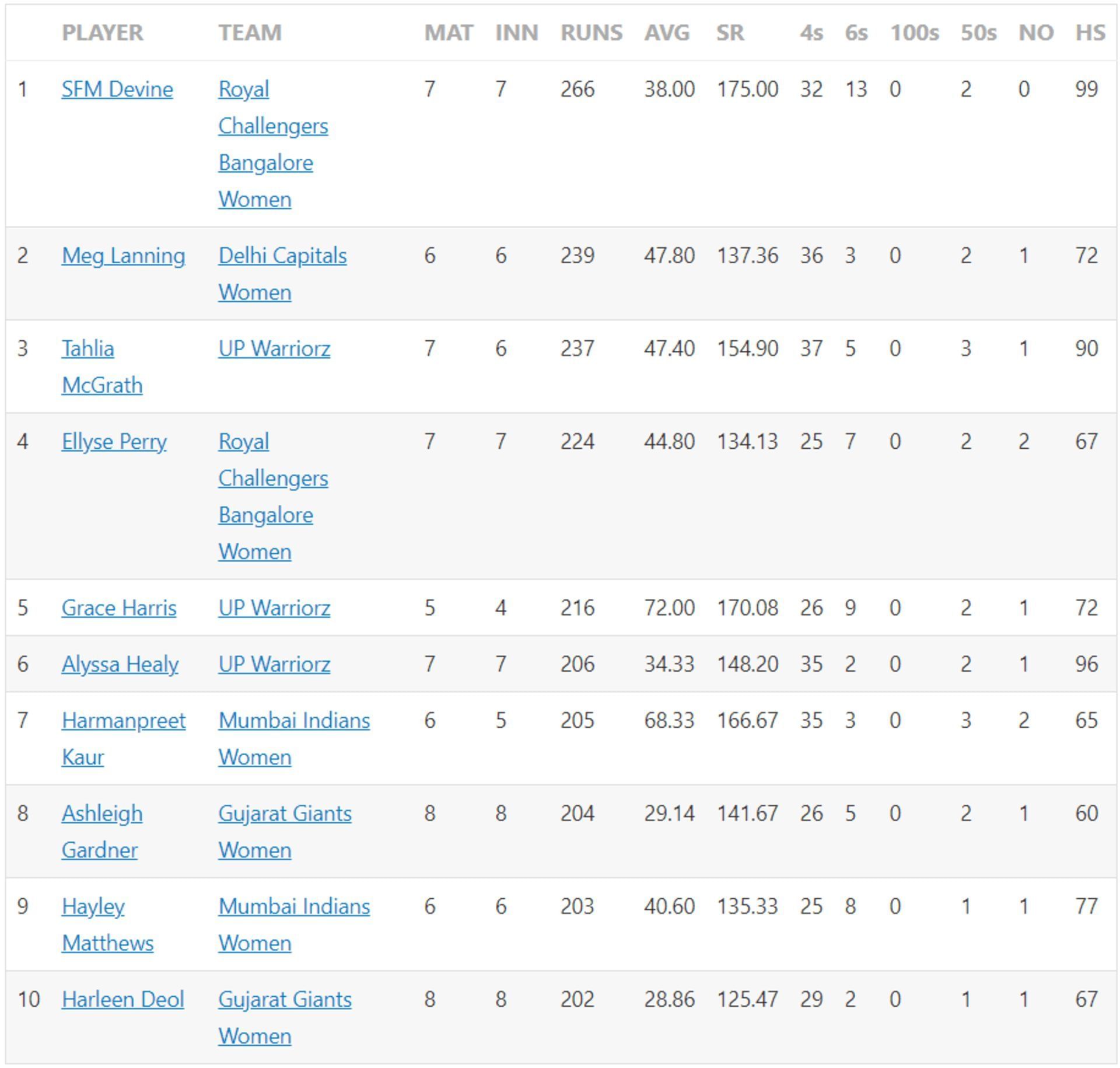 Sophie Devine is still the holder of the WPL Orange Cap after slamming the highest score of the tournament so far.