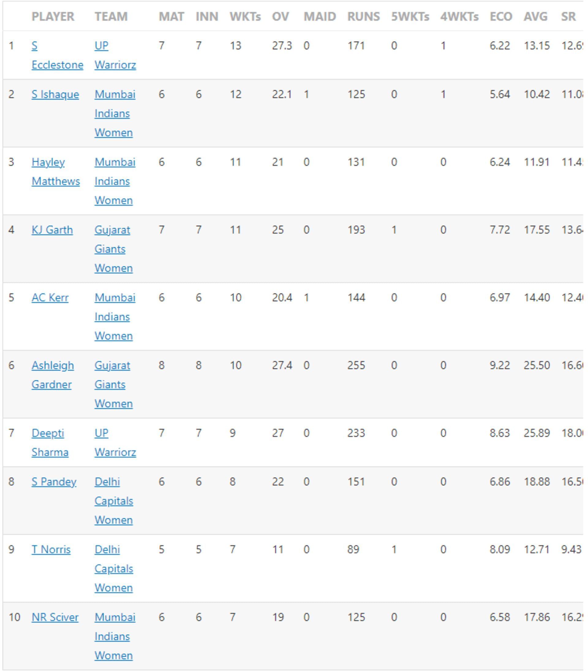 Spinners Ashleigh Gardner and Deepti Sharma also mark their presence on the WPL Purple Cap list in sixth and seventh place, respectively.