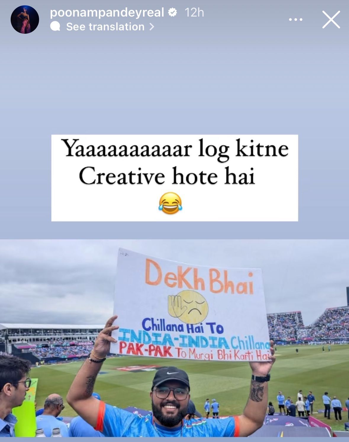 Team India secured a thrilling six-run win over arch-rivals Pakistan at Nassau County International Cricket Stadium in New York in the ongoing 2024 T20 World Cup on Sunday, June 9. Following the clash, Indian actress Poonam Pandey shared an Instagram story, reacting to a fan holding a funny poster.