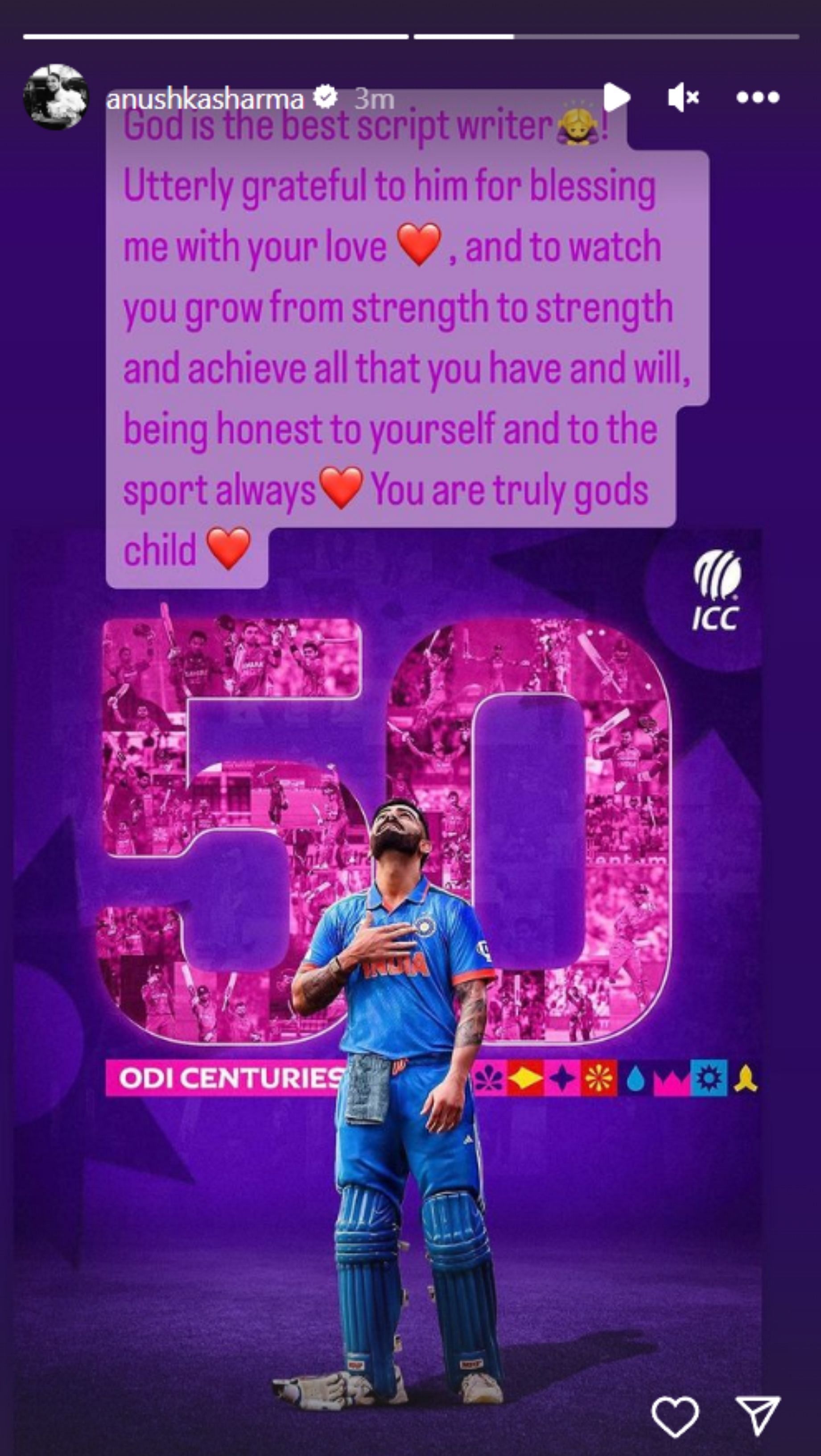 Anushka Sharma celebrated her husband Virat Kohli's record-breaking 50th ODI century on Wednesday (November 15) with a special story on her Instagram handle. The iconic batter's knock helped India beat New Zealand by 70 runs in the first semi-final of the 2023 World Cup at the Wankhede Stadium in Mumbai.
