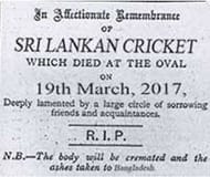 The Island newspaper published an obituary for Sri Lanka cricket after their heartbreaking loss. The headline read,”RIP Sri Lanka”. It further added: "In affectionate remembrance of Sri Lankan cricket which died at the Oval on 19, March 2017. The body will be cremated and the ashes taken to Bangladesh."