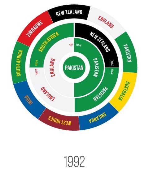 Novelty and change marked the 1992 World Cup, staged jointly by Australia and New Zealand. Imran Khan led Pakistan to their maiden World Cup title, South Africa took part for the first time, and a series of fresh ideas were implemented in the format and rules but the new regulations for deciding rain-curtailed matches drew a lot of flak.