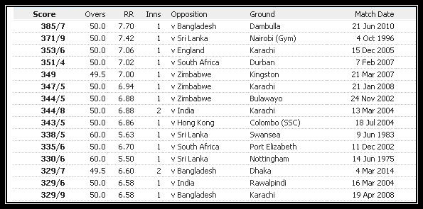 Pakistan scored 328 for seven in 49.5 overs in their chase of 327 against Bangladesh in the 8th match of Asia Cup 2014 on 4th March 2014. This is the highest successful run chase in one day internationals by Pakistan in cricket history.
