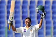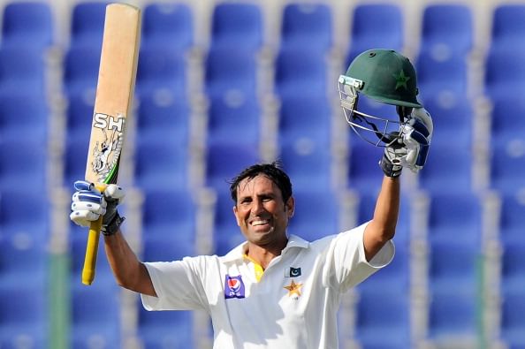 Pakistan batsman Younis Khan raises his bat to the crowd after scoring a century (100 runs) during the second day of the first cricket Test match between Pakistan and Sri Lanka at the Sheikh Zayed Stadium in Abu Dhabi on January 1, 2014. Sri Lanka were bowled out for 204 in their first innings of the first Test against Pakistan in Abu Dhabi.