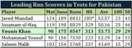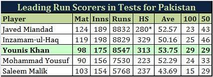 Younis Khan also has some more achievements to look forward to. He needs only 286 runs to go past Javed Miandad and become Pakistan's leading run scorer in test cricket; only 453 runs to become the first Pakistani to score 9,000 test runs; only 1 century to become the first Pakistani batsman to hit 30 test centuries.