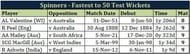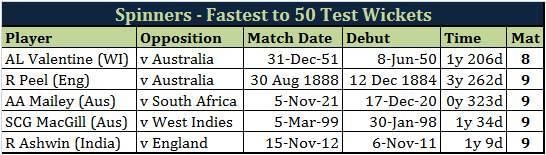While the overall international record for fastest 50 test wickets is 6 tests, held by Charlie Turner from Australia, the record among spinners is held by Alfred Valentine, the slow left-armer from West Indies, who managed the feat in 8 tests. Yasir can't break that record but he definitely has the opportunity to equal it.