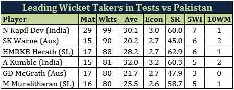Rangana Herath has also been very successful in tests against Pakistan picking up 88 wickets in only 17 matches, making him the third most successful bowler against Pakistan. He needs only 3 more wickets to surpass Shane Warne, and only 12 more wickets to become the first bowler in the world to pick up 100 wickets in tests against Pakistan.