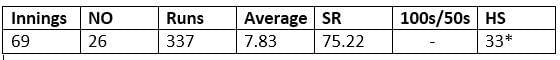 It is no secret that his abilities with the ball and bat were miles apart and the statistics prove that as he scored just 337 runs from 69 innings at No 10 with a high score of 33*.