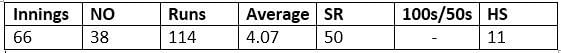 From 66 innings, McGrath scored just 114 runs with the highest score of just 11.