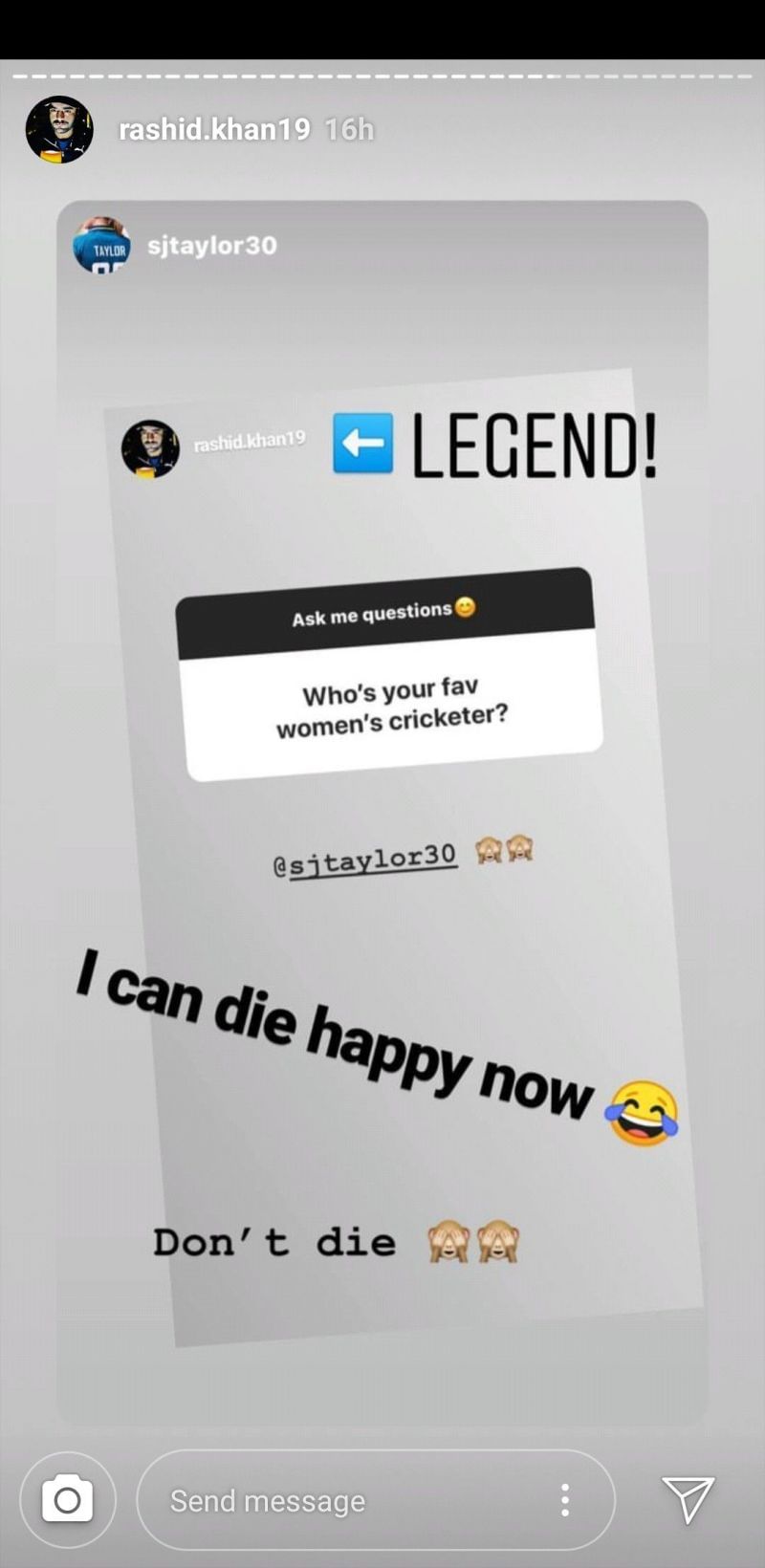 Replying to a fan's question, "Who's your fav Women's Cricketer?" Rashid Khan tagged England's wicket-keeper Sarah Taylor's profile. Taylor who is away from the sport currently was quick to respond as she called Rashid a legend and added that she can die happily now with a laughing emoji. Khan replied Taylor in one of the best ways possible as he wrote "Don't die" replying to Sarah.