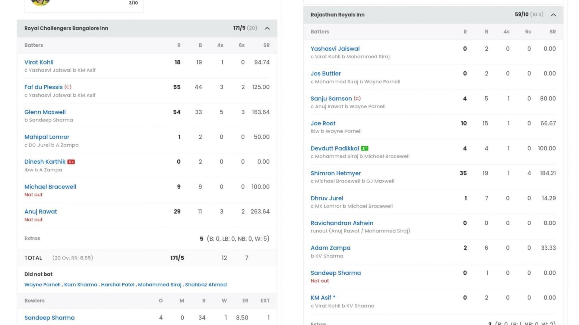 In reply, the Rajasthan Royals, barring Shimron Hetmyer, never got going. Wayne Parnell took three wickets, while Michael Bracewell and Karn Sharma accounted for two wickets each. RCB eventually bundled out their opponents for 59 runs in 10.3 overs.