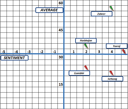 X-Axis: The horizontal axis measures fan-sentiment with respect to the players in concern. ‘Measures’ may not be the best terminology here, as this is essentially subjective, based on the vociferousness of the recalls for these cricketers, across social media as well as traditional channels, in recent times. While the negative axis is just for aesthetic appeal, it is anyone’s guess that all these players will be in the positive on this parameter, i.e. to the right of the Y-axis.