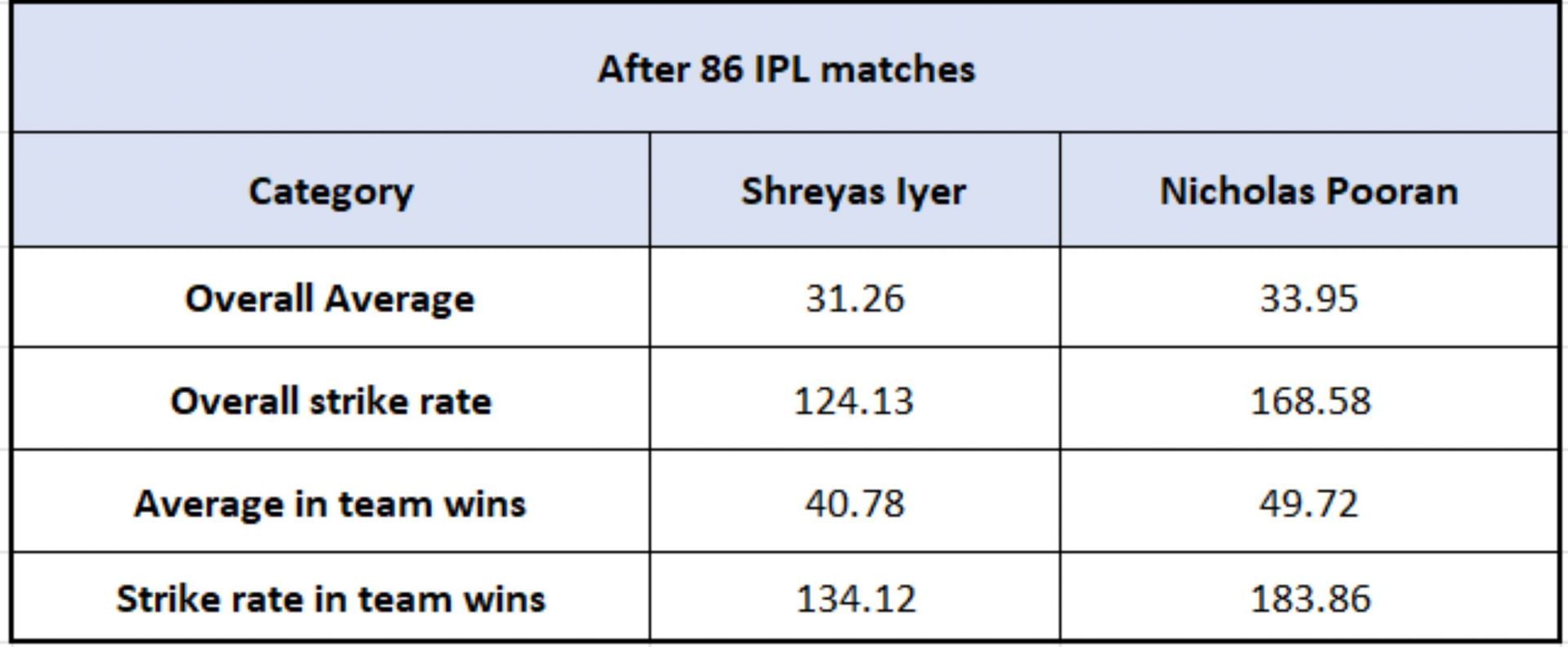 The above table reflects a stunning difference between the duo on impact through 86 IPL matches. While Iyer's average of over 31 at a strike rate of 124.13 are fairly impressive, they pale compared to Pooran's 33.95 and 168.58 splits.