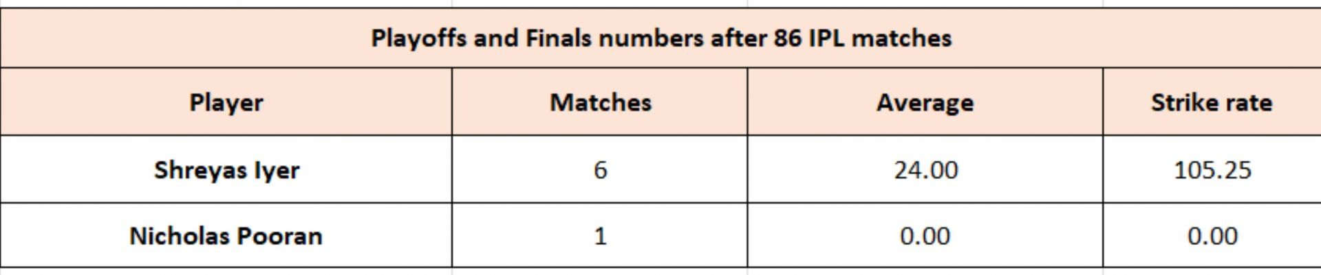 Finally, we shift to how Iyer and Pooran performed in the knockout stages through their first 86 IPL games. While the latter has often been out of the playoffs for most of his IPL career, Iyer led DC to their maiden IPL final in 2020.