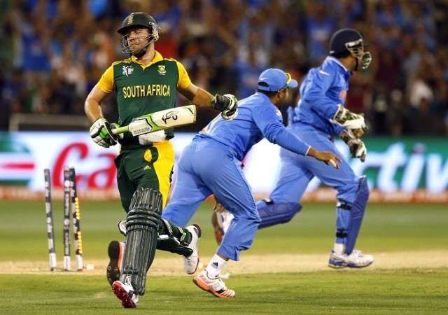 After a beautiful stroke through backward point off the third ball for a boundary, the fifth ball produced a wicket for South Africa, courtesy some stunning fielding by de Villiers. Charging towards a misfielded ball, de Villiers had one stump to aim at and he managed to knock it down, catching Sharma short of his crease, sparking wild celebrations on the ground.