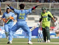 Just when the game looked to be under full control of the pair, the hard-hitting Yuvraj suffered a hamstring pull when he was on 82. After treatment for a few minutes, the brave-hearted Singh roared like a champion. Though he might have been limping in pain, his shots were as ferocious as ever and he brought up his first one-day hundred against Pakistan.