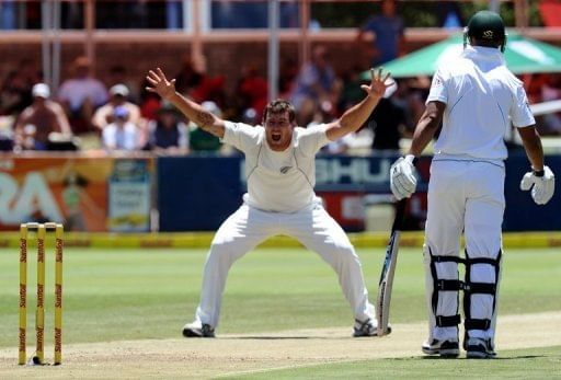 New Zealand bowler Doug Bracewell (centre) and South Africa batsman Graeme Smith, January 2, 2013 in Cape Town, Newlands. South Africa eventually bowled out the Kiwis for just 45 in the first Test, confirming their status as the world’s number one side.