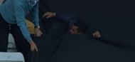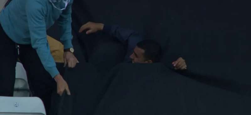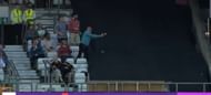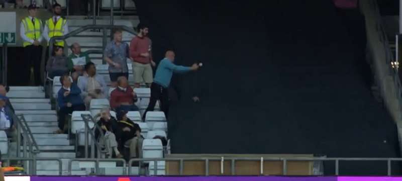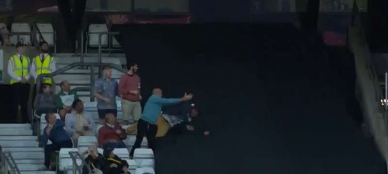The spectator judged the ball, but upon realising this won’t be an easy one, tilted toward his left side, ready to stretch and grab it. He ended up completely missing the ball, getting a finger to it and then hysterically falling into the tarpaulin covering the adjoining column of seats.