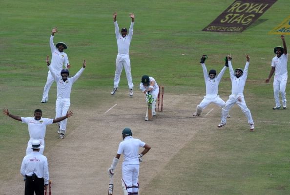 AB de Villiers and Hashim Amla’s 25 run partnership lasted for 147 balls. De Villiers even survived a close leg before shout, which the Lankans reviewed in vain, before Rangana Herath pitched one on the leg to go past the outside edge and disturb the woodwork. Faf du Plessis was given out the very next ball, only for the decision to be overturned via a review. The ball was clearly missing the leg stump according to the Hawk-eye. Amla’s marathon innings ended soon after Tea, and Du Plessis, too, followed his captain. Herath’s twin strikes pushed his side close only for the rain to interrupt again.