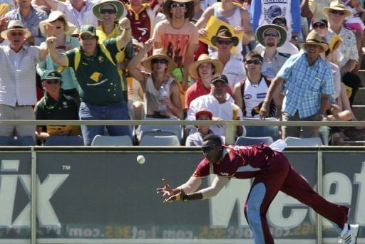 West Indies fielder Kieron Pollard tries a boundary catch off the bat by Australia’s George Bailey during the one-day international cricket match between Australia and the West Indies at the WACA ground in Perth on February 3, 2013. Australia eventually beat the West Indies by 54 runs in their second one-day international at the WACA.