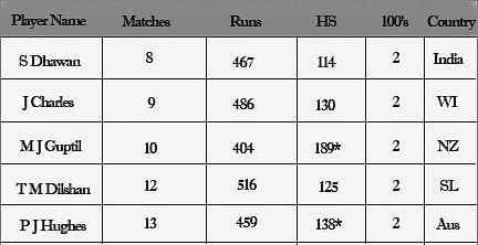 Though all five players have scored two hundreds each, it is India’s Shikhar Dhawan who tops the list as he played the least number of matches. He is followed by West Indian J Charles.