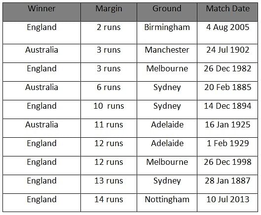 England won the second Test of the 2005 season just by 2 runs, thanks to Andrew Flintoff’s all-round performance in the 2nd innings. It is still the smallest winning margin by runs in the history of the Ashes.