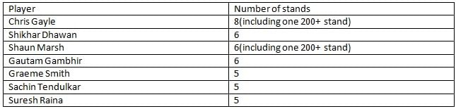 Here is a list of batsmen involved in the highest number of 100+ partnerships in all the five editions of Indian Premier League. Chris Gayle, who has played for RCB and KKR, tops the list with eight 100+ stands, including one 200+ stand.