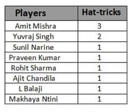 Amit Mishra claimed his third hat-trick in IPL yesterday against Pune Warriors India. Mishra came up with an all-round performance against Pune Warriors as he scored 30 off 24 balls and then followed it up with figures of 4/19 in four overs, with all his wickets coming in his last over.