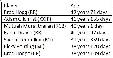 Here is a list of the oldest players playing in IPL 6. Rajasthan Royals spinner Brad Hogg is the oldest among the veterans featuring on the list. Sachin Tendulkar and Brad Hodge are the only players on the list who still have not retired from all forms of international cricket.