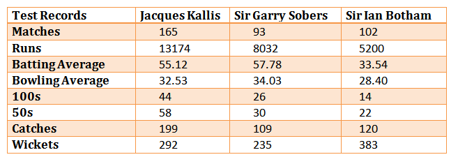 Here is a statistical look at how Jacques Kallis fares in comparison with couple of other great all rounders of all time in Sir Garry Sobers and Sir Ian Botham.