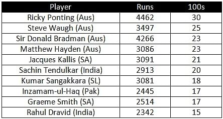 Ricky Ponting has scored most number of hundreds (30) in Tests that has led his team to victory. Next in the list is Steve Waugh with 25 hundreds scored in winnings Tests. Here’s the list of Top 10 batsmen: